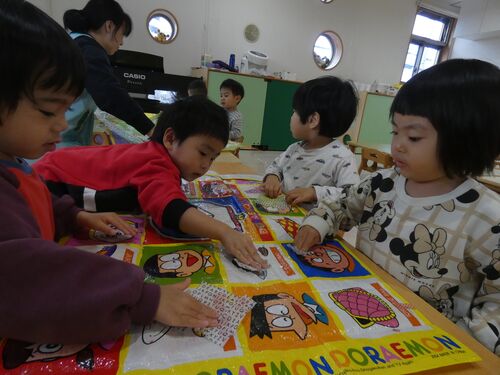 みかん組さん、しっかりと椅子に座って 先生のお話を聞いていますね! 何か楽しいことが始まるぞ♪ と集中力も高まります! みゃくみゃくの周りにペタペタ。。。 何色のシールにしようかなぁ? この色にきーめた☆ 個性豊かなみかん組さん! 10人十色ならぬ…