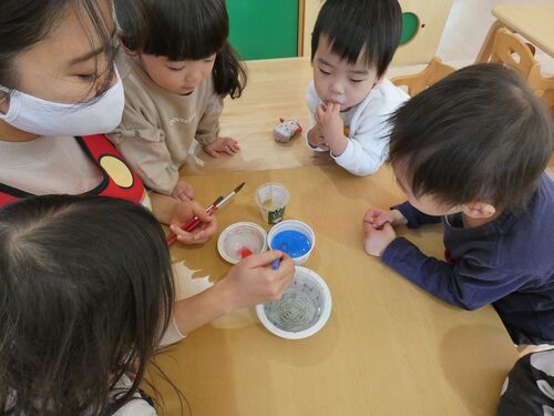 この青いジュースおもしろうそうだね!絵の具だよ!! いちごさん似合ってますね!! みかんさんになったらこっちのお机とおいすになるんだよ~^^ 絵の具のジュースに△の紙を入れてみると・・・ あら、不思議・・・にじみ絵ができました^^ 進級をイメー…